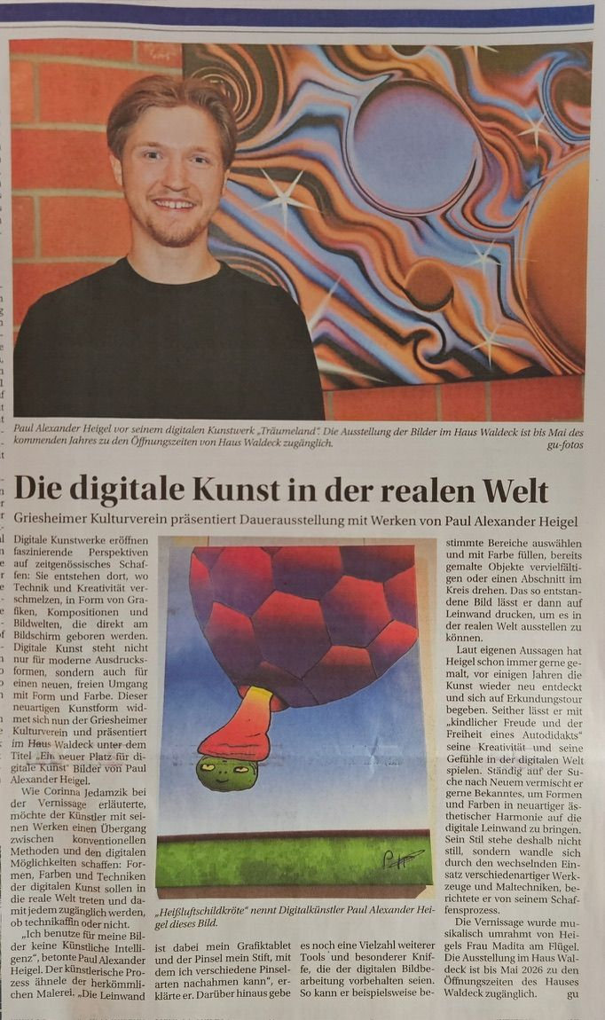 unser Mitglied Paul Alexander Heigel mit Unterstützung des Griesheimer Kulturvereins seine digitalen Kunstwerke im Haus Waldeck in einer Einzelausstellung bis Mai 2026 präsentieren kann .