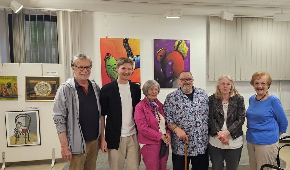Impression von der Vernissage am 28.4.2025 : v.l.n.r. : Rolf Maltry, Paul Heigel , Petronella Adams , Jürgen Frick, Eva Schlingmann, Ilse Riese (Foto: Madita Heigel)