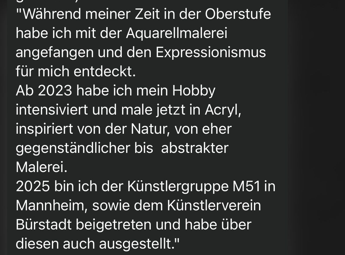 2019 bin ich über eine Fortbildung zur Pädagogischen Fachkraft fürs Drucken im Schuldruckzentrum in Darmstadt bei Matthias Heinrichs zur ersten Kunstrichtung gekommen. Seitdem drucke ich dort und in Schulen mit Kindern mit viel Freude. 2022 habe ich ein paar Buntstifte mit in den Urlaub genommen und intensiv mit dem Zeichnen begonnen. Vor allem die Vogelwelt hat es mir dabei angetan. Seitdem male und zeichne ich täglich und finde darin eine tiefe Erholung. In der Enkaustiktechnik probiere ich mich immer wieder aus; kreiere Bilder aus Wachs und Schellack. Seit 2024 male ich regelmäßig im Atelier Süd bei der Künstlerin Adele Vetter und lerne wöchentlich Neues dazu. Zurzeit male ich Portraits in Acryl, wobei die Farben der Gesichter die Gefühle widerspiegeln, die die Personen in mir hervorrufen.